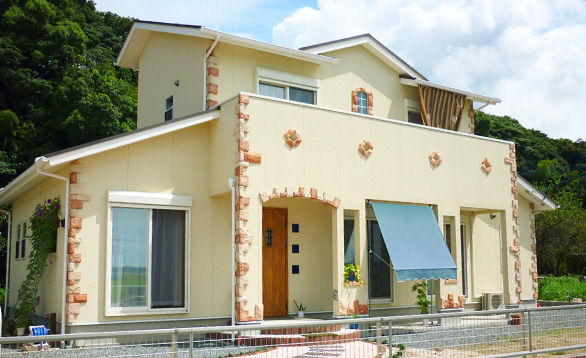 オレンジ系の屋根&クリーム色の外壁にレンガを埋め込んだ、一見すると「南欧風カフェ」のような可愛らしいお家に仕上がりました。玄関ポーチや内装、造作家具の細部にもこだわり、家で過ごす時間を満喫できるようなやさしい雰囲気を演出しています。