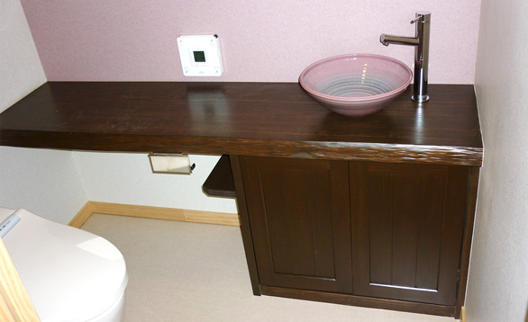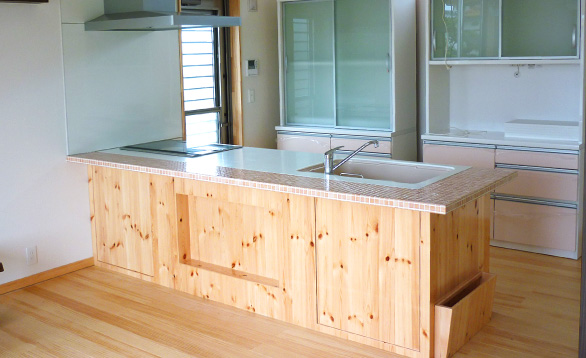 モザイクタイルと木目でつくった造作キッチンをはじめ、木製カウンター&ピンクの手洗いボウルが特徴のトイレの手洗い場、剥き出しの木の梁材をアクセントにした開放感あるリビングなど、家全体で木のぬくもりを感じることができます。